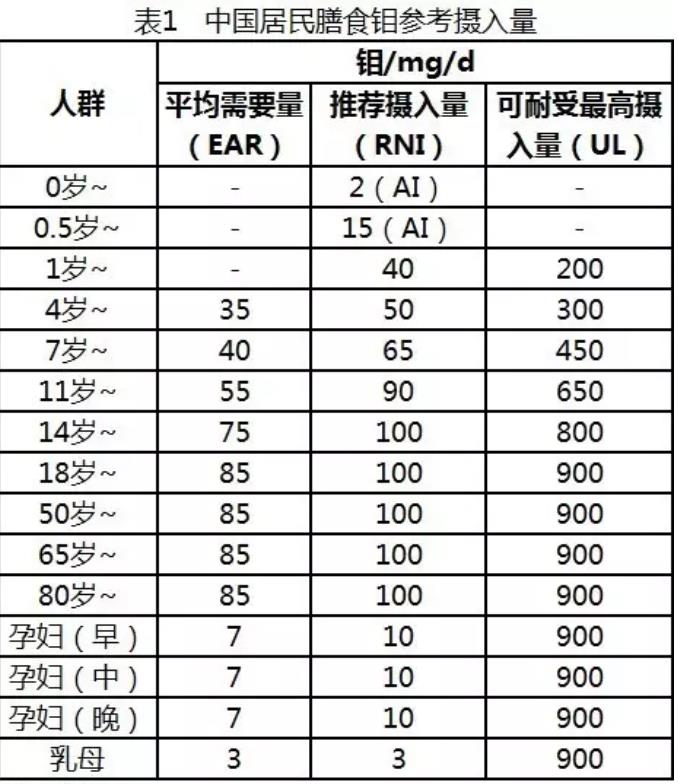中国营养学会编制的《中国居民膳食营养素参考摄入量》中钼的参考摄入量见下表: